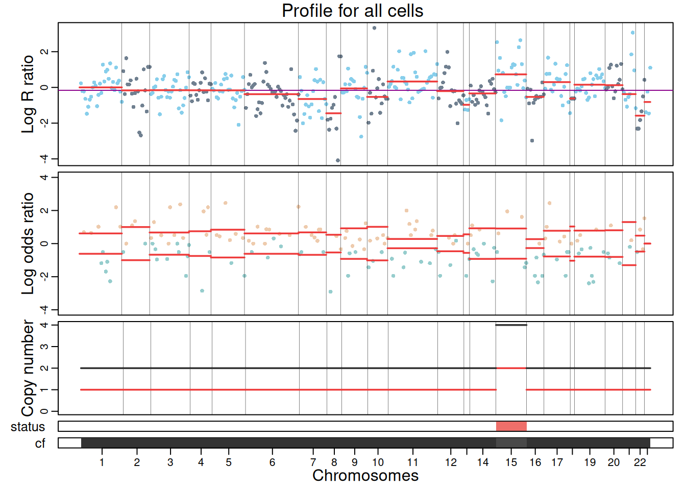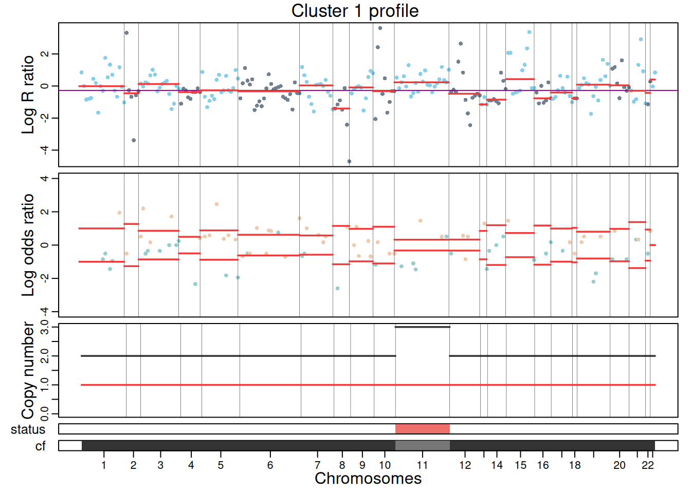 - Allele data: log odds ratio values (log-odds of reference vs alternative allele counts) at variant position and segment medians - deviation from 0 suggests allelic imbalance, useful to distinguish LOH, copy-neutral LOH, or allele-specific CNAs.